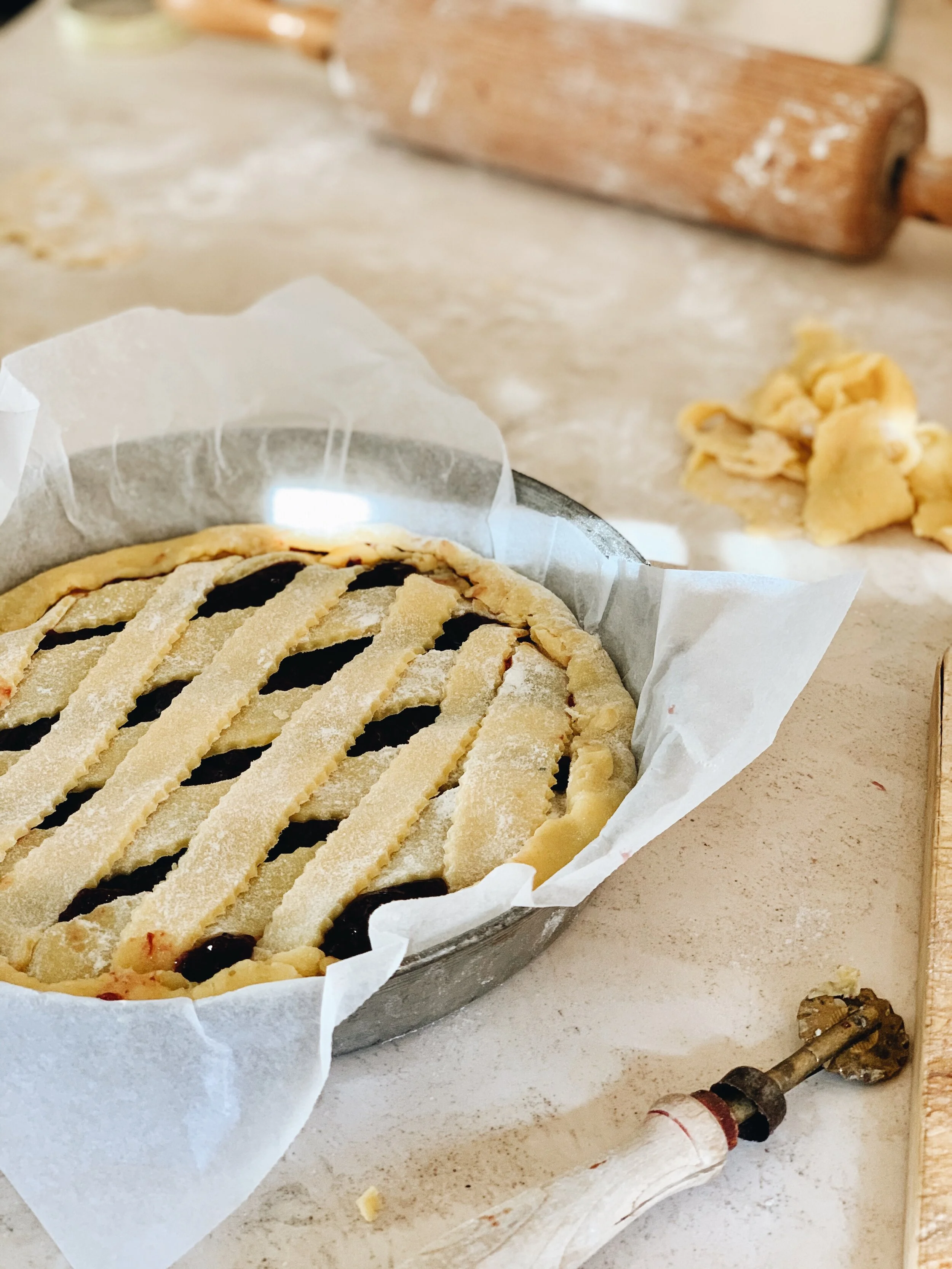 Passato il tempo necessario, stendete la frolla, adagiatela poi su una teglia imburrata, aggiungete la marmellata e la griglia tipica della crostata;