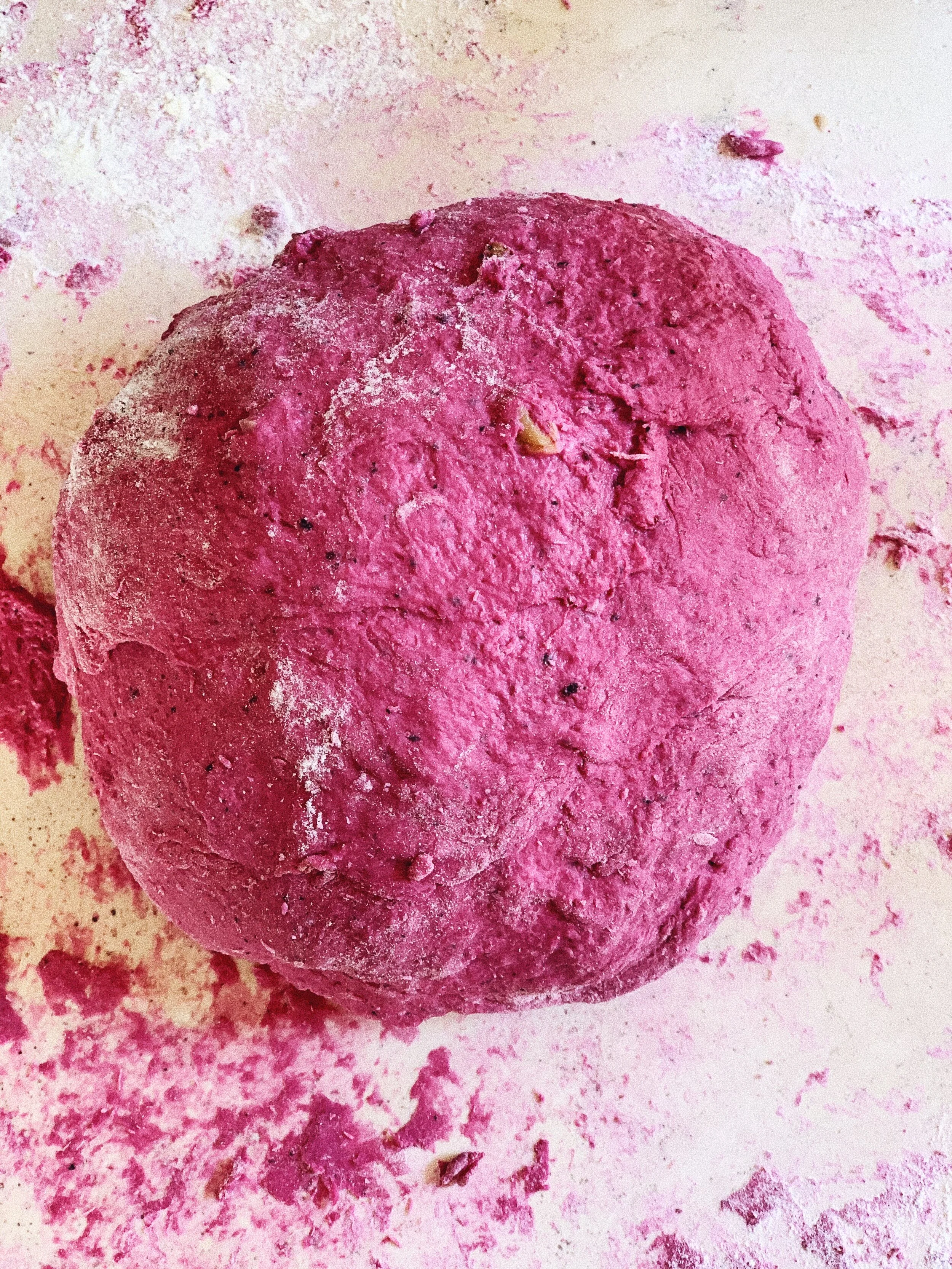 Aggiungere in una ciotola la farina, la barbabietola, il lievito, il sale, le noci e man mano l’acqua (non tutta insieme);